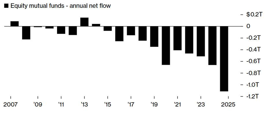 Active equity mutual funds experienced more than $1 trillion in outflows in 2025—the 11th year of net outflows and the steepest of the cycle. By contrast, passive equity exchange-traded funds attracted more than $600 billion.