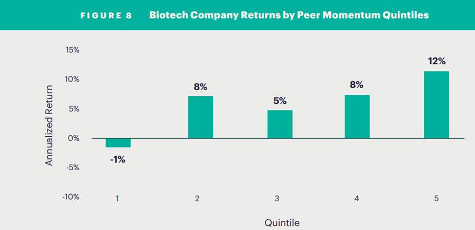 4. Momentum = Peer Performance: Traditional momentum (a stock’s own trailing returns) doesn’t work in biotech. But peer momentum—how a company’s scientific peers have performed—spreads returns effectively. Stocks whose peers returned strongly delivered 15% annualized returns versus -1% for those whose peers underperformed.