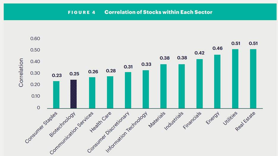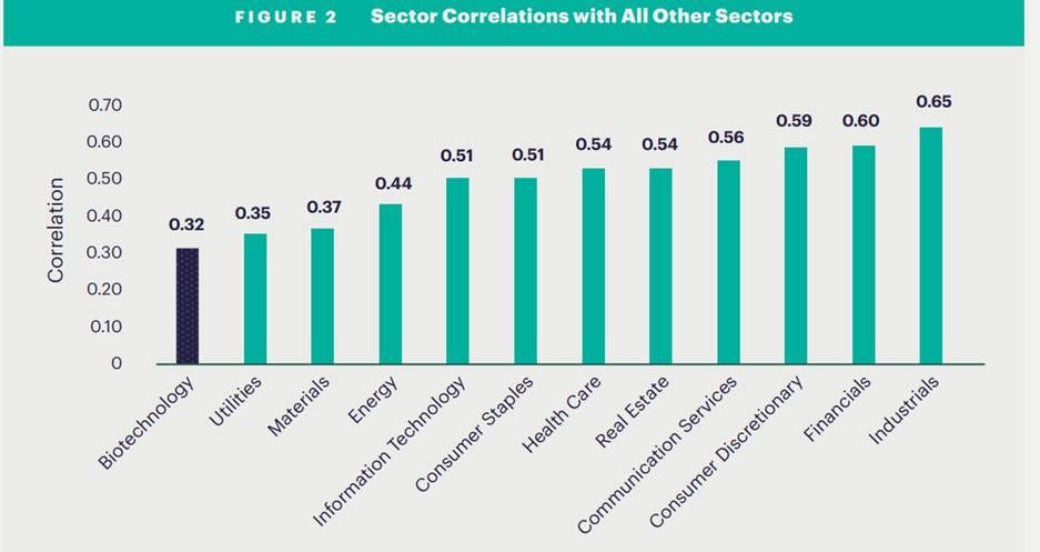 Low correlation: Biotech returns show the lowest correlation with other sectors, making it an excellent diversifier.