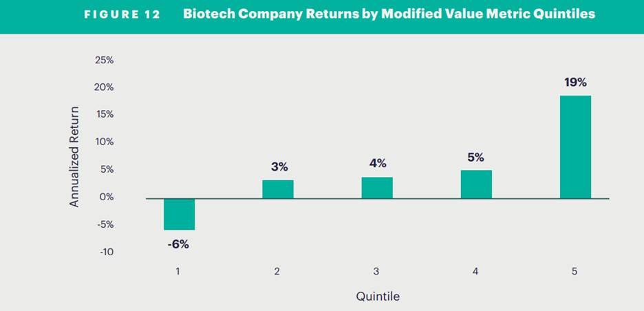 2. Value = Spending-Based Metrics: Instead of anchoring value to profits, they anchor it to spending. Since clinical trials are expensive and not undertaken lightly, total spending provides a meaningful measure of a company’s research commitment. Companies that are cheap relative to their spending levels and peer companies tend to outperform.