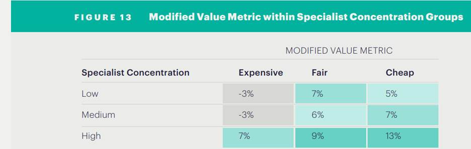 5. Combining valuation and quality (specialist consensus): Measuring them independently reveals that the modified value metric still spreads returns—the best performing stocks are those that are favored by specialists and are cheap, while the worst performing stocks are the ones that are spurned by specialists and are expensive.