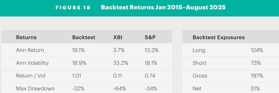 The solution: systematic shorting. Biotech’s high failure rate means there are many reliably bad companies to short. By constructing a disciplined long-short portfolio using their factor model, the researchers achieved: