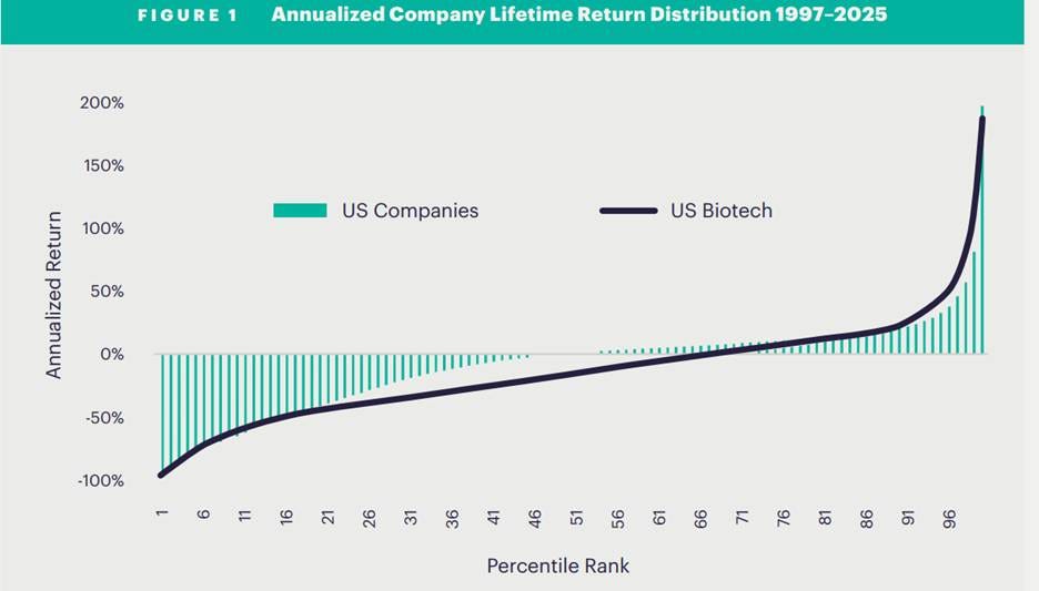 The paper opens with a sobering reality check. The median biotech company delivers an annualized return of -15%, compared to 1% for the median US company. These aren’t companies with struggling business models—they’re science experiments that investors fund in hopes of discovering breakthrough drugs.