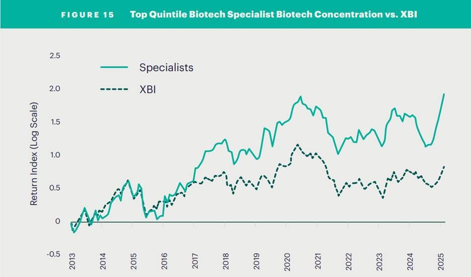 When they sorted biotechs by how heavily specialist funds owned them, a clear pattern emerged. Companies with the highest specialist concentration delivered 20% annualized returns, while those with no specialist ownership returned lost 2% per annum. The story of Pharmacyclics, recounted in For Blood and Money: Billionaires, Biotech and the Quest for a Blockbuster Drug, exemplifies this perfectly—specialist funds like OrbiMed and Baker Brothers identified its potential when it traded at $1.28, years before its eventual $21 billion acquisition at $261.25 per share.