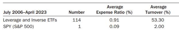 Turnover and Expenses: Equity leveraged and inverse ETFs are very expensive and have a very high turnover.
