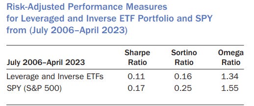 · Sharpe ratios, and other risk-adjusted return metrics were lower for the leveraged and inverse ETFs.